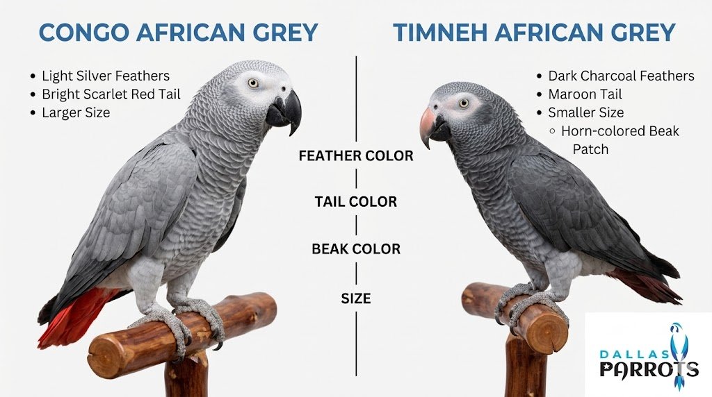 Congo african greys are bigger lighter in color and have a bright red tail. Timneh african greys are smaller darker and have a maroon tail with a horn-colored upper beak. Personality wise timnehs tend to be calmer and start talking earlier.