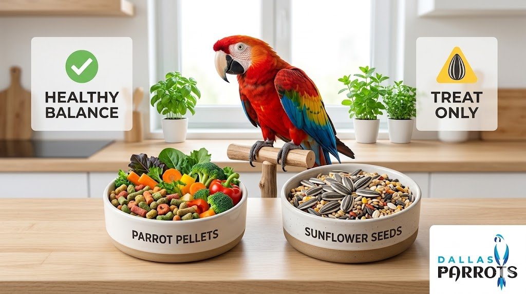 This question comes up more than any other in the bird world. So let me break it down.Pellets are the foundation of a healthy parrot diet because they pack balanced nutrition into every bite. A formulated pellet has the vitamins minerals protein and fiber your bird needs. Seeds alone don’t. A seed-only diet causes vitamin A deficiency obesity and fatty liver disease. Most board-certified avian vets recommend 60 to 70 percent pellet diet with the rest from fresh foods and a small seed treat allowance.