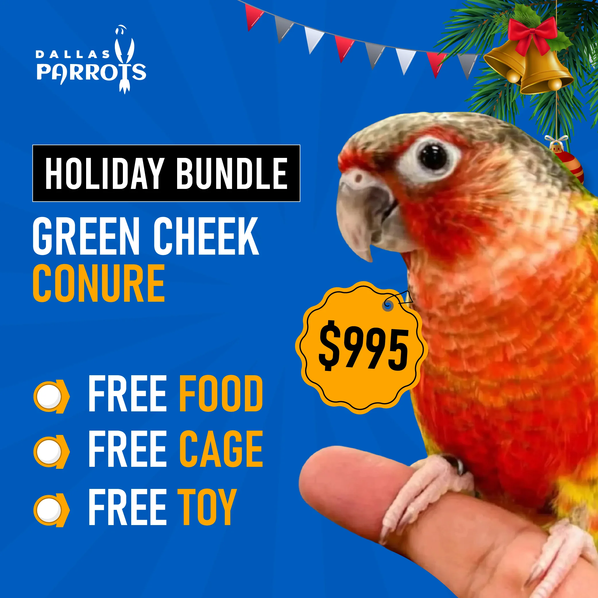 This bundle simplifies bird ownership by combining all essential items into one premium seasonal offer. Instead of sourcing a bird, cage, food, and toy separately, you receive a complete setup chosen for care, comfort, and convenience. The Green Cheek Conure Normal Bundle at $995 offers charm, playful personality, and companionship with ease and confidence.